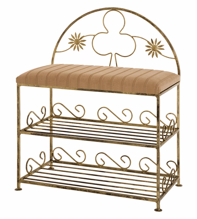 Nábytek / Pohovky a lavice / Lavice s botníkem - Čalouněná lavice na boty s dvojitou policí Botník se sedákem a opěradlem je praktické a zároveň efektní řešení, které šetří místo i čas. Nezabere mnoho místa, takže ji lze umístit i do úzkých chodeb a malých předsíní. Robustní konstrukci z práškově lakovaného kovu zdobí ohýbané tvary s motivem karetního trojlístku, které nábytku dodávají jemnost a šik. Měkký sedák je naopak čalouněný látkou v jedné z několika trendy barevných variant, z nichž si můžete vybrat, a zajišťuje tak uživatelský komfort. Dvě přídavné police z robustního drátu se budou hodit pro ukládání bot a doplňků. Regál s opěradlem a sedákem z nabídky internetového obchodu Versanis se hodí do klasického i moderního prostředí.