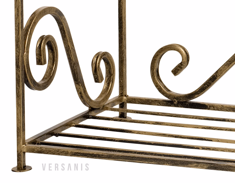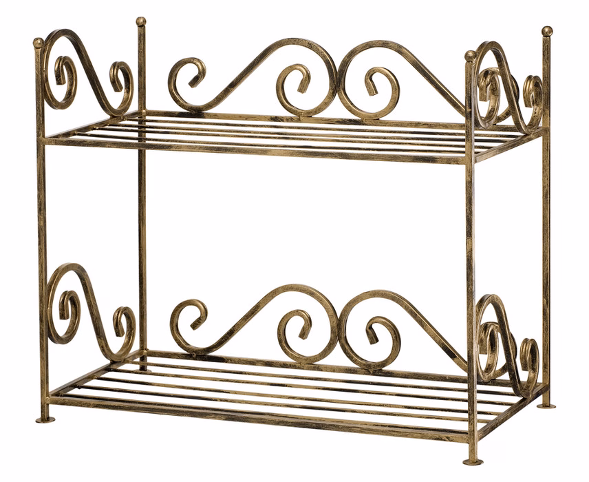 Pokoje / Obývací pokoj / Police a regály / Police - Kovový stojan na boty Představený výrobek je ideálním dekorativním prvkem, který bude působit elegantně a stylově již při vstupu do bytu. Skvěle se bude hodit jako dekorace do předsíně, haly nebo chodby. Stojan má dvě široké police pro uložení několika párů bot nebo drobných předmětů, jako jsou klobouky, rukavice nebo šály. Tento model je vyroben z kovu nejvyšší kvality, což zaručuje výjimečnou robustnost. Police jsou velmi robustní a stojan je pevný a stabilní. Kromě funkčních vlastností má výrobek i prvotřídní estetické kvality. Vyznačuje se jemným vzhledem a precizním zpracováním. Ozdobný dekor ve tvaru písmene "S" mu dodává na půvabu, jednak zdůrazňuje jedinečný charakter výrobku, jednak působí jako ochrana předmětů umístěných na polici. Rozhodněte se pro styl a eleganci hned od okamžiku, kdy překročíte práh svého domova. Botník s krásným dekorem bude předním dekorativním prvkem každé předsíně, haly nebo haly. Jistě okouzlí hosty i rodinu!