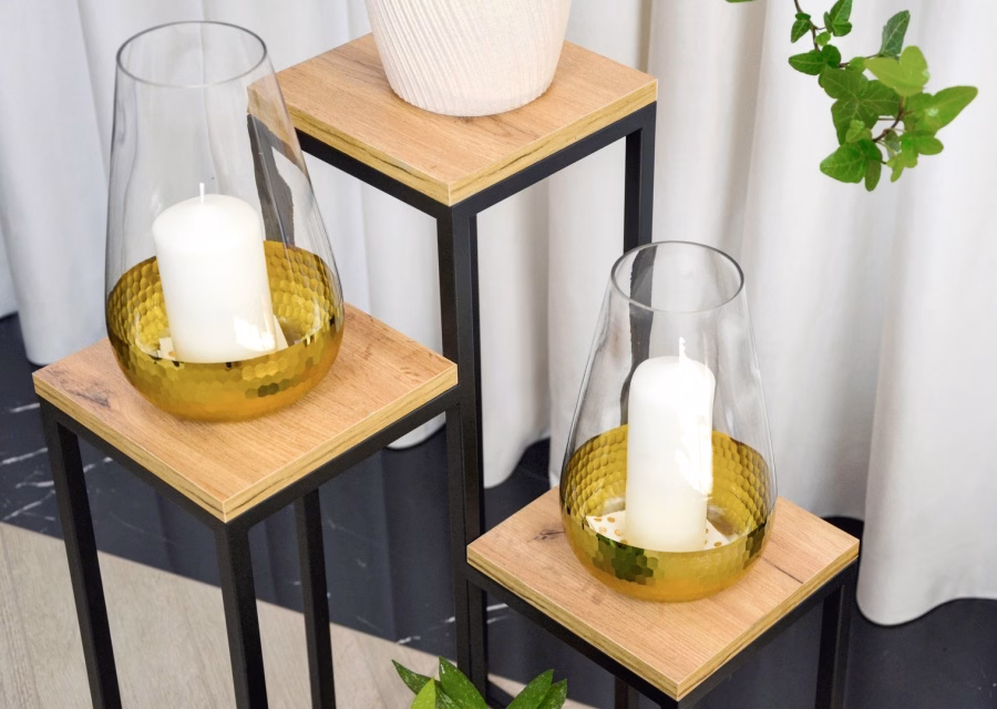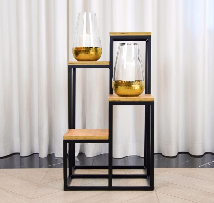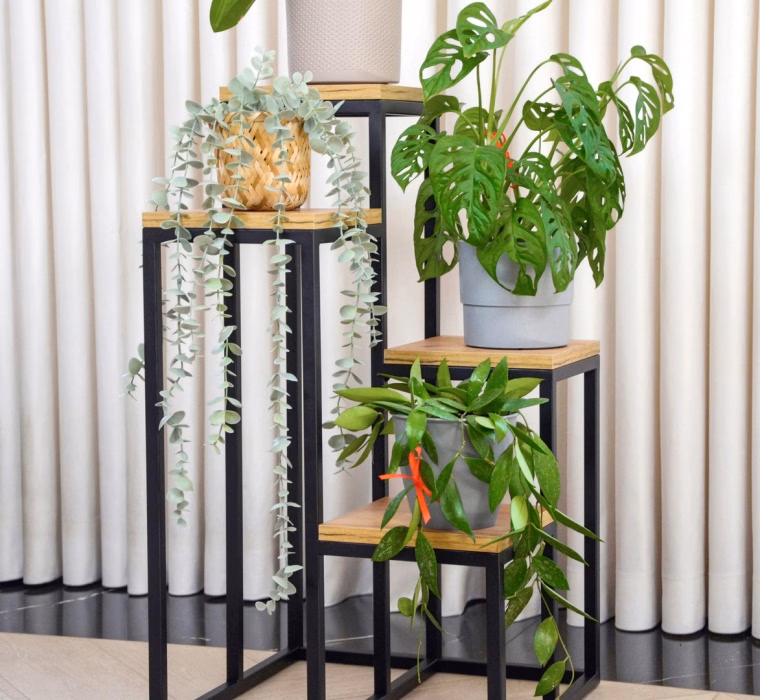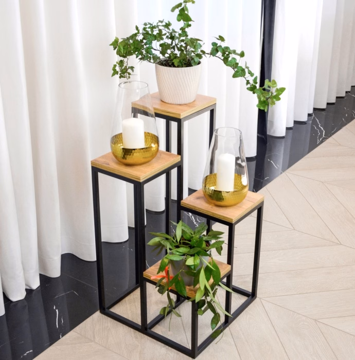 Interiérové dekorace / Květináče / Velké květináče - Kovový stojan pro 4 rostliny Čtyři plošiny s dřevěnými deskami Šířka květinového podstavce - 20 cm. Univerzální, minimalistický tvar Stabilní a robustní konstrukce Nátěr lakem odolným proti vlhkosti a korozi Díky kompaktním rozměrům zabírá málo místa Kombinace modernosti a funkčnosti Deska stolu z nábytkové desky v odstínu dub Craft Výrobek, který vám bude sloužit mnoho let Dodává se kompletní bez nutnosti vlastní montáže Podstavec je chráněn gumovými nožičkami, aby se výrobek nepohyboval a nepoškrábal podlahu. Kovový stojan, volně stojící záhon Představujeme multifunkční kovový stojan, který se skvěle hodí jako záhonek nebo stojan na kompozice. Tento výrobek byl navržen tak, aby dokonale doplnil užitný prostor a dodal mu jedinečný charakter a výraz. Díky své antikorozní konstrukci bude velmi vhodný jako dekorace na zahradu, mezipatro nebo terasu. Povrchová úprava barvou a odolnost proti vlhkosti Stojan byl natřen práškovou barvou vytvrzující při vysokých teplotách. Tato úprava zajišťuje odolnost výrobku vůči povětrnostním vlivům, takže je ideální nejen do interiérů, ale i na mezipatra, terasy a balkony.