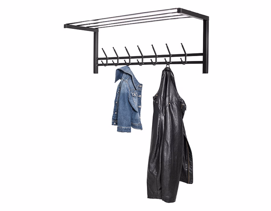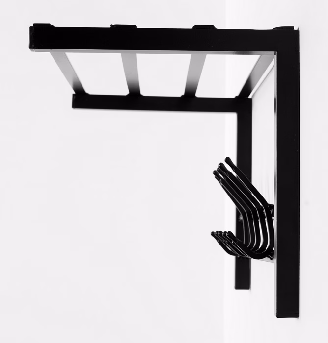 Pokoje / Předsíň / Věšáky / Věšáky nástěnné / Věšáky nástěnné s policí - Nástěnný věšák s policí - 70 cm. V malé chodbě se počítá každý centimetr prostoru. Chytře navržený nábytek, jako je například policový věšák Versanis, jej pomůže dokonale uspořádat. Věšák visí na stěně v té správné výšce a umožňuje volně zavěsit svrchní oděvy na kovové háčky, stejně jako odložit drobné předměty, jako jsou rukavice, čepice a šály, na praktickou a prostornou polici. Tento stylový a zároveň mimořádně robustní design působí elegantně a lehce. Kovová konstrukce nikdy nevyjde z módy a umožňuje mnoho kombinací s rustikálním dřevěným nábytkem i moderním proskleným nábytkem. Barvu profilů lze sladit podle vlastních preferencí, čímž se doladí uspořádání předsíně až do detailů.