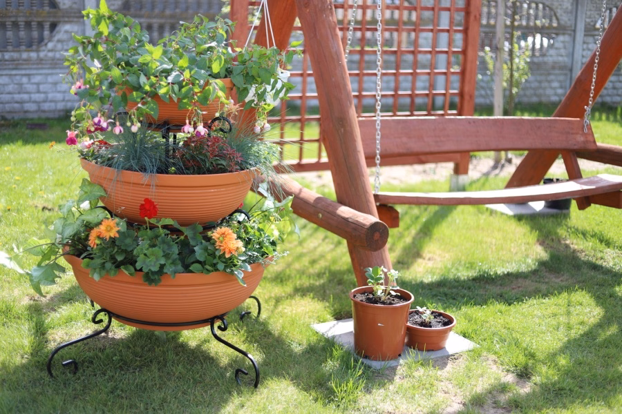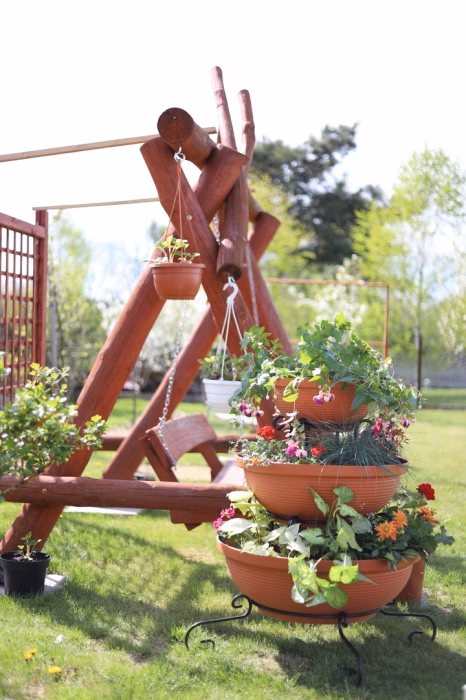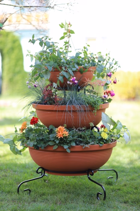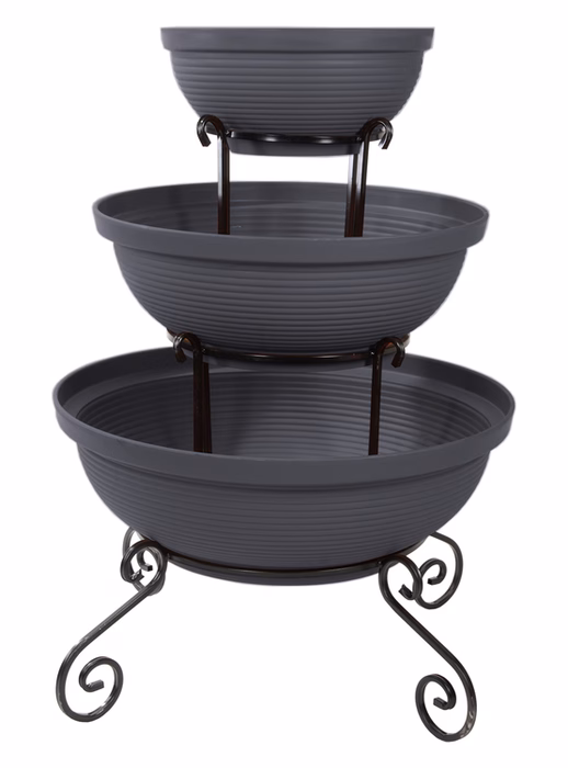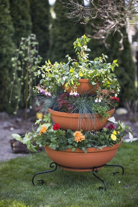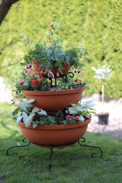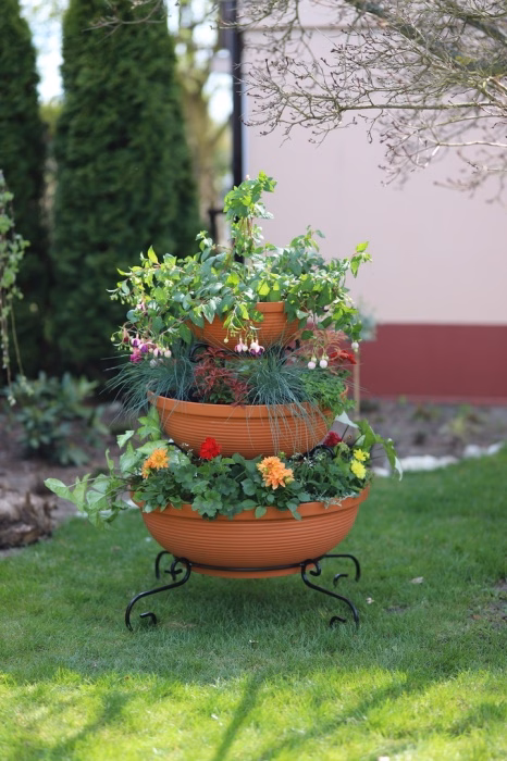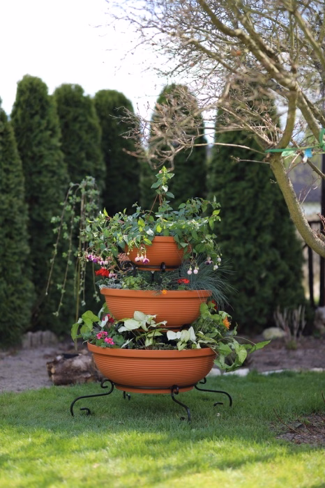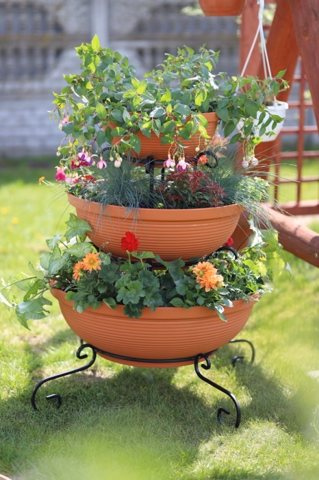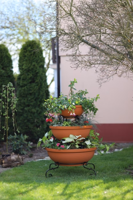Zahrada a balkon / Zahradní nábytek / Květináče do zahrady - Sloupový držák na květiny - dekorativní - 3 misky Sníte o velkolepém vzhledu své zahrady nebo terasy? Vyberte si moderní záhon z internetového obchodu Versanis. Skládá se ze tří květináčů v černé nebo terakotové barvě, naskládaných od největšího po nejmenší na jednoduchém rámu, vyrobeném nadčasovou technikou kovotepectví. Tento stojan je stejně jako ostatní zahradní květináče z obchodu Versanis stabilní, trvanlivý a odolný proti dešti či poškrábání. Je mimořádně univerzální - hodí se k mnoha dalším prvkům prostředí. K tomu přispívá i možnost zvolit si barvu kovové konstrukce. Pro dosažení nejlepšího efektu se doporučuje do závěsných květináčů zasadit rostliny, které budou shora krásně kaskádovitě padat dolů a lahodit oku hostů i domácích.