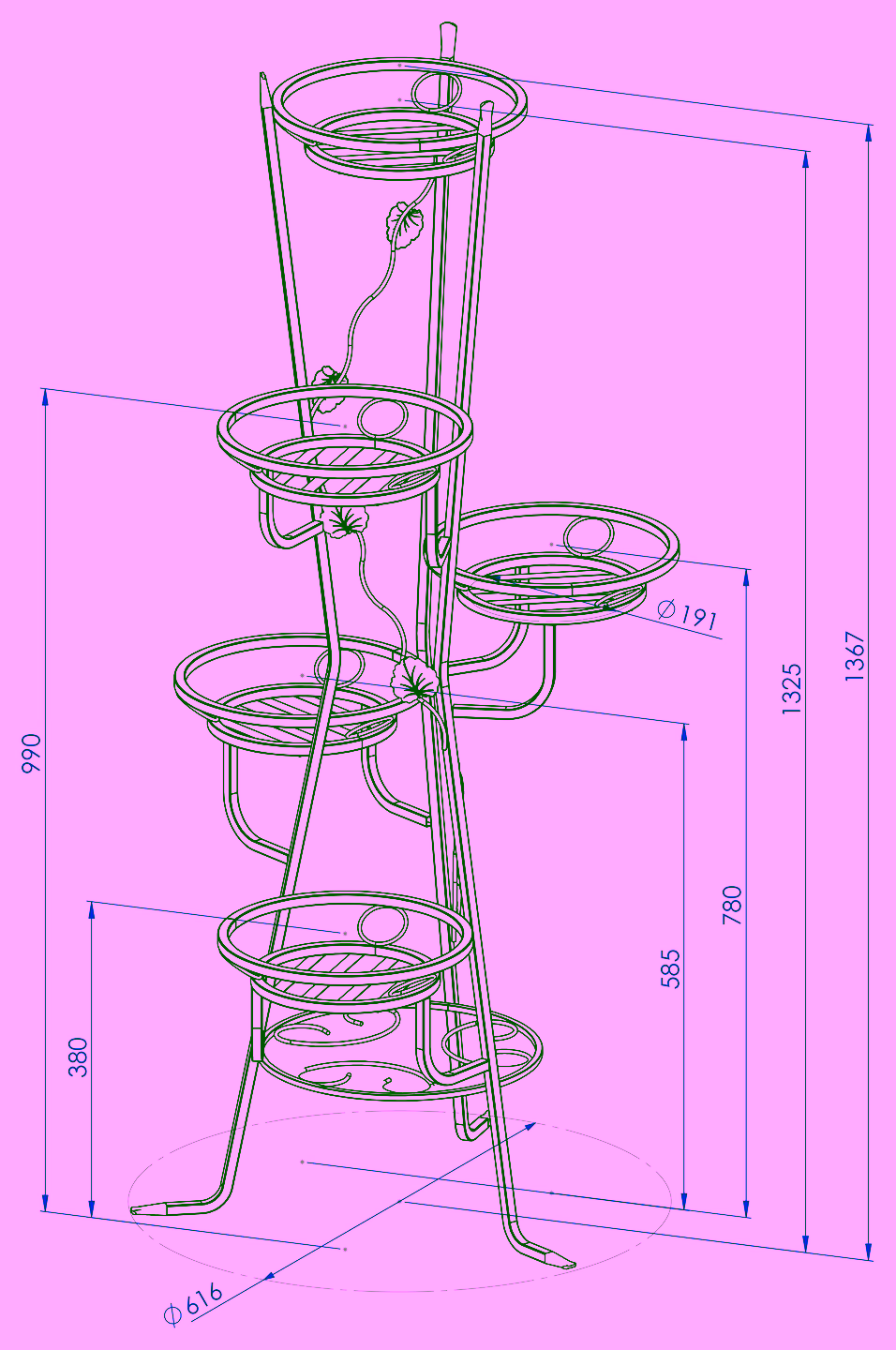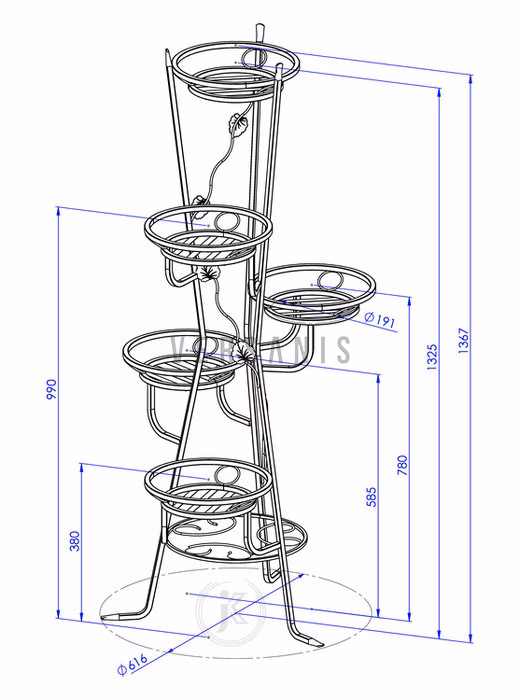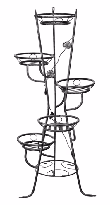 Interiérové dekorace / Květináče / Velké květináče - Vysoký stojan na květiny Stojan na květiny z internetového obchodu Versanis působí na jedné straně velmi romanticky a na druhé straně velmi moderně. Hodí se jak na terasu v secesním stylu, tak do minimalistického aranžmá. Je vyroben stále módní technikou kovu a zdoben motivy listů z kované oceli a zaujme svým elegantním designem. Tento stojící záhon se skládá z pěti robustních a objemných objímek na květináče, na kterých můžeme vystavit své oblíbené rostliny, včetně těch, které se kaskádovitě snášejí shora. Kovová konstrukce je mimořádně odolná a trvanlivá. Díky možnosti zvolit si barvu kovového rámu lze stojan snadno kombinovat s dalšími doplňky a nábytkem na terase, balkoně nebo v zahradě.